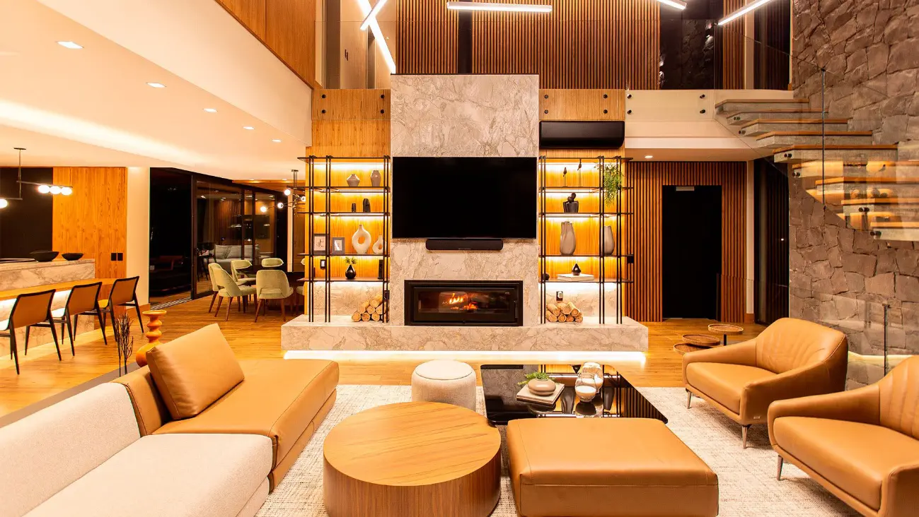 Logo na chegada, o hall suntuoso com pé direito duplo dá o tom do projeto. A área social integra estar e jantar, com cozinha conectada ao convívio, além de sala de jantar para 12 pessoas. Para receber, o destaque é o Espaço do Chef, com churrasqueira, fogão a lenha e bar, integrado ao Espaço Relax, com decks amplos e lareira externa.
